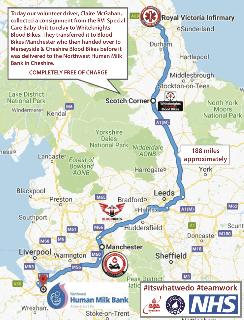 Today our volunteer driver, Claire McGahan, collected a consignment from the RVI Special Care Baby Unit to relay with Whiteknights Yorkshire Blood Bikes. They transferred it to Blood Bikes Manchester who then handed over to Merseyside & Cheshire Blood Bikes before it was delivered to the Northwest Human Milk Bank in Cheshire #itswhatwedo #teamwork #bloodbikes