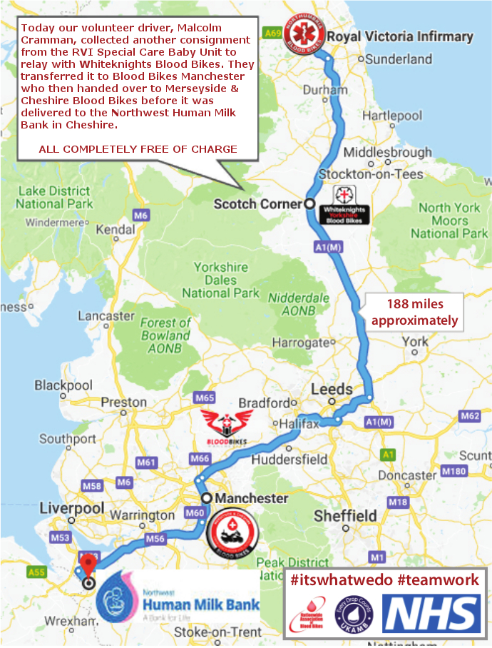 Today our volunteer driver, Malcolm Cramman, collected another consignment from the RVI Special Care Baby Unit to relay with Whiteknights Blood Bikes. They transferred it to Blood Bikes Manchester who then handed over to Merseyside & Cheshire Blood Bikes before it was delivered to the Northwest Human Milk Bank in Cheshire.